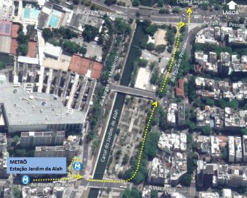 • Estação Jardim de Alah – Atravessar a Av Borges de Medeiros e seguir pela ponte até a calçada da Av Epitácio Pessoa – Seguir pela Av Epitácio Pessoa -Atravessar para a Lagoa Rodrigo de Freitas próximo ao Clube Caiçaras