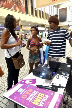 “Essa época do ano muitas mulheres são abordadas de forma desrespeitosa e indesejada, acredito que a sociedade está precisando de mais informação. Então essa ação que está acontecendo hoje, aqui na Central, é muito importante. Eu estou muito feliz em estar participando,” – afirma a escritora Marcele Pin.