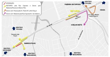Retorno sentido Deodoro: os veículos deverão seguir pela Av. Brasil, sentido Centro, até a altura de Coelho Neto, acessar a Rua Cajurana pela alça reaberta e seguir em direção a Deodoro.