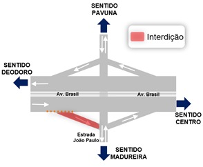 Desvio sentido Madureira: os veículos deverão seguir pela Av. Brasil, sentido Centro, até a altura de Coelho Neto, acessar a alça reaberta até a Av. Pastor Martin Luther King Júnior e seguir pela Av. dos Italianos. Outra opção é fazer o retorno na Rua Cajurana e seguir até Barros Filho para acessar a Estrada João Paulo em direção a Madureira.