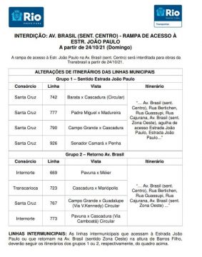 Publicado em 22/10/2021 - 09:00 | Atualizado em 21/10/2021 - 23:49A CET-Rio informa que a alça de acesso da Avenida Brasil, sentido Centro, para a Estrada João Paulo será totalmente interditada para obras do BRT Transbrasil a partir das 8h de domingo (24/10) até 22 de abril do próximo ano. Para minimizar os impactos da nova intervenção e viabilizar uma rota de desvio mais curta para Madureira e Pavuna e o retorno para o sentido Deodoro, a alça de acesso da Brasil, sentido Centro, para a Rua Cajurana será reaberta. Sinalização específica será instalada, e as condições do trânsito serão monitoradas.
