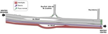 • Veículos provenientes da Av. Brasil: serão desviados para a pista central sob o Viaduto de Manguinhos e poderão retornar para a pista lateral na altura da Passarela 5.