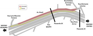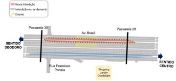 – Nos dias 28/10 (quinta-feira) e 29/10 (sexta-feira), das 7h30 às 16h: interdição de 1 faixa (lado direito) da Av. Brasil, pista lateral, sentido Deodoro, na altura da Passarela 1.