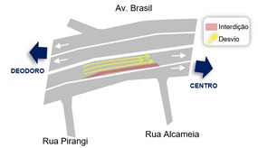 – Entre os dias 28/10 (quinta-feira) e 4/11, das 7h30 às 16h: interdição de 1 faixa (lado esquerdo) da Av. Brasil, pista central, sentido Deodoro, entre a Rua Bulhões de Marcial e a Rua Isidro Rocha.