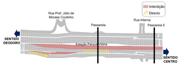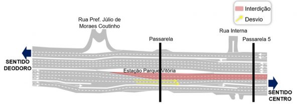Das 22h às 5h: interdição de uma faixa da Avenida Brasil, pista lateral, sentido Deodoro, na altura da Rua Nova Jerusalém. Desvio: os veículos serão desviados na própria pista, no trecho com estreitamento.