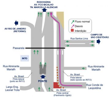 DESVIOS: todos os veículos provenientes da Rua Conde de Leopoldina serão desviados para a Avenida Brasil, pista lateral (lado oposto ao INTO) e poderão acessar a pista central pela agulha localizada após a Rua Santos Lima.