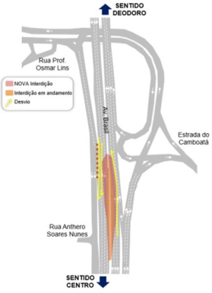 No dia 17/4 (domingo), das 7h30 às 18h: interdição de duas faixas (lado direito) da Avenida Brasil, sentido Deodoro, na altura da Rua Loreto do Couto. DESVIO: os veículos serão desviados na própria pista, no trecho com estreitamento.