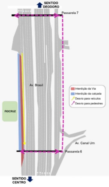 Entre os dias 18/4 (segunda-feira) e 30/4, das 7h30 às 16h: interdição de uma faixa (lado direito) da Avenida Brasil, pista lateral, sentido Deodoro, na altura da Fiocruz, para serviços de carga e descarga;