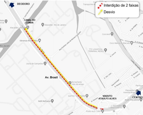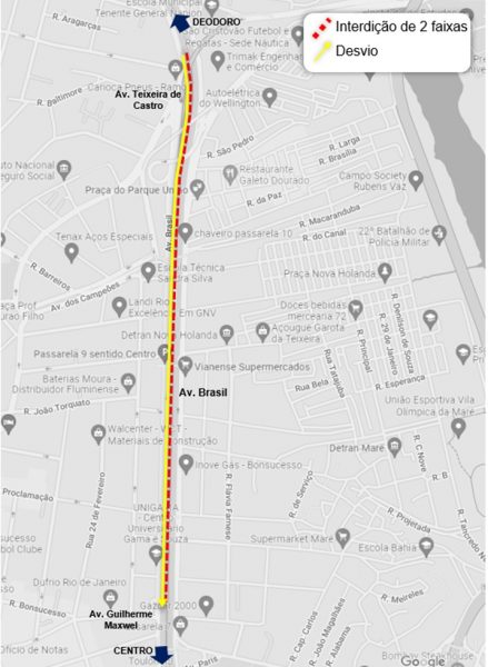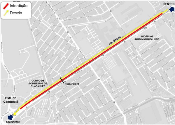 Entre os dias 9/5 (segunda-feira) e 13/5 (sexta-feira), das 22h às 5h: interdição total da pista central da Avenida Brasil, sentido Deodoro, no trecho entre o Shopping Jardim Guadalupe e a Passarela 33. Desvio: os veículos serão desviados para a pista lateral após a Rua São Benedito e poderão retornar para a pista central na altura da Estrada do Camboatá.