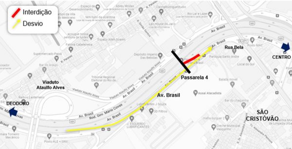 A partir das 12h do dia 7/5 (sábado) até o dia 3/6: a agulha provisória existente na Avenida Brasil, sentido Centro, da pista central para a pista lateral, na altura da Passarela 4. Desvio: os veículos com destino a Rua Bela/São Cristóvão ou que desejam acessar a pista lateral da Avenida Brasil deverão utilizar a agulha existente após o Viaduto Ataulfo Alves;