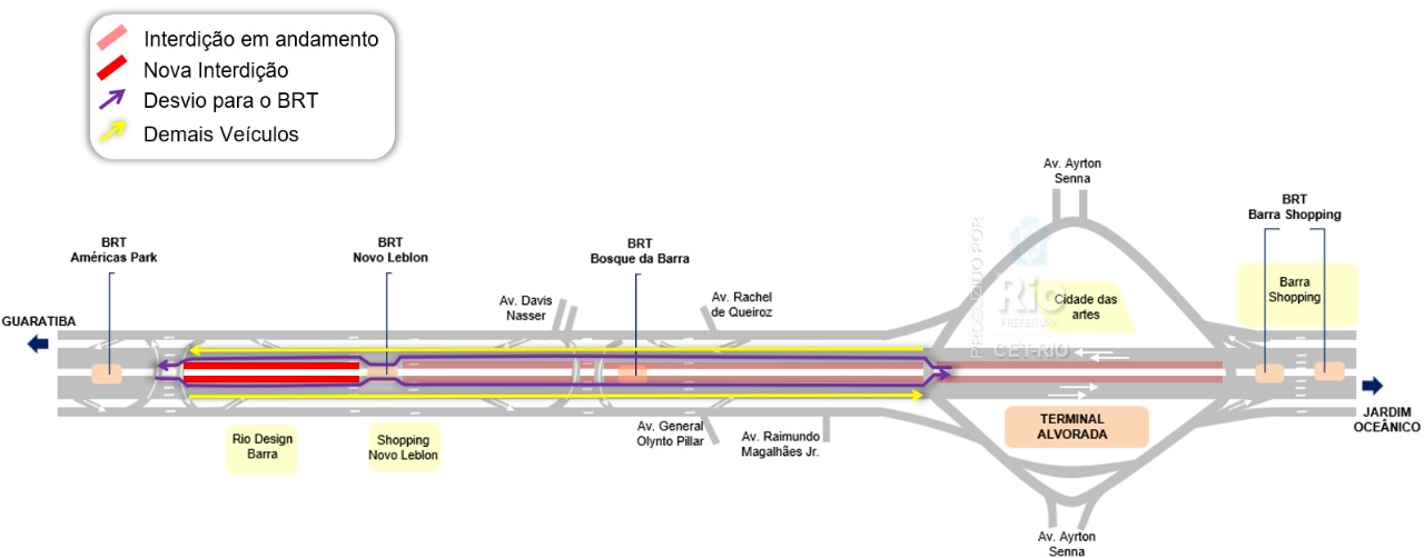 A partir das 7h30 deste sábado até às 13h30 do dia 8 de dezembro: interditar a calha do BRT na Avenida das Américas, em ambos os sentidos, no trecho entre a estação Novo Leblon e o retorno do Rio Design. A estação do BRT Novo Leblon permanecerá aberta até a liberação da estação BRT Bosque da Barra.