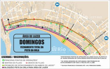 No domingo (21/5), a pista da orla da Avenida Atlântica deverá ser mantida interditada após as 18h até o horário de término do último show (previsto para as 20h) com a liberação do público do evento. A pista junto às edificações, em reversível, deverá ter desvio contingencial pela Rua Bolívar.