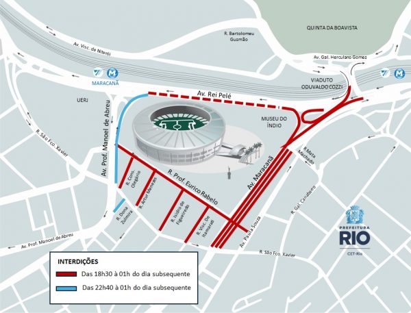 CET-Rio preparou esquema especial de trânsito para jogo no Maracanã - Marcos de Paula/ Prefeitura do Rio                  A CET-Rio montou esquema de trânsito para o jogo entre Flamengo e Sport, neste sábado (1/11), às 21h, no Maracanã, pelo Campeonato Brasileiro. As interdições ao tráfego de veículos na região começam a partir das 18h30 e vão até 1h de domingo (2/11). Além dos locais regulamentados com proibição de estacionamento, outras vias também estarão restritas ao estacionamento a partir das 10h.