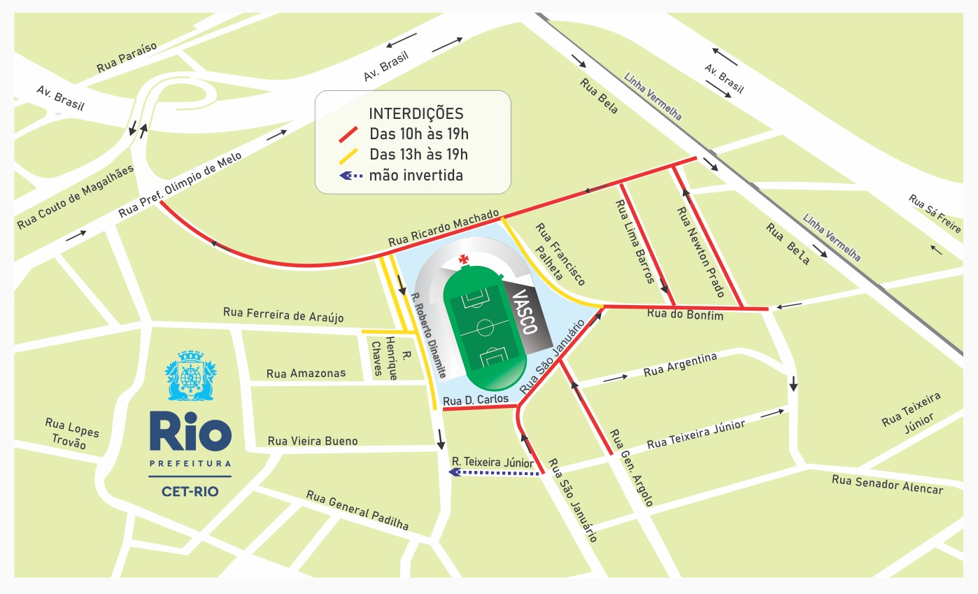 – Rua Teixeira Júnior, entre as ruas São Januário e Roberto Dinamite, funcionará no sentido Rua São Januário à Rua Roberto Dinamite