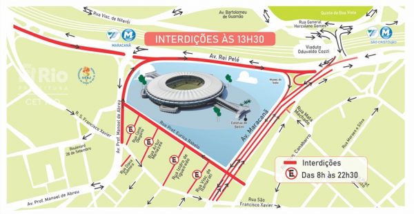 O esquema especial de trânsito vai interditar ruas no entorno do Maracanã - Arquivo/Prefeitura do Rio A CET-Rio implantará operação especial de trânsito, neste domingo (17/3), para o jogo entre Nova Iguaçu e Vasco, às 16h, no Maracanã, pela pela semifinal do Campeonato Carioca. A partir das 13h30 haverá interdições na região. A CET-Rio contará com 65 agentes e apoiadores de tráfego, nove veículos operacionais e 16 motocicletas, que estarão empenhados na orientação do trânsito. E, ainda, no reforço das informações do tráfego, 13 painéis de mensagens variáveis informarão sobre os horários dos fechamentos e as rotas alternativas, com o objetivo de manter a segurança viária e a fluidez do trânsito.