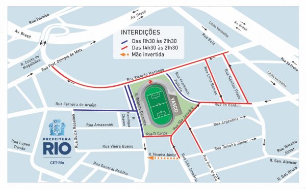 Entorno de São Januário terá interdições para jogo do Vasco - Divulgação A CET-Rio montou esquema de trânsito para o jogo entre Vasco e Santos, neste domingo (30/3),, às 18h30, em São Januário, pelo Campeonato Brasileiro. A partir das 11h30 haverá interdições ao trânsito de veículos na região.