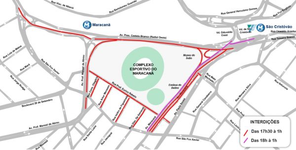 O entorno do estádio do Maracanã terá interdições para primeiro jogo da final do Carioca - Marcos de Paula/Prefeitura do Rio A CET-Rio montou esquema especial de tráfego para o jogo entre Brasil e Chile, que ocorrerá na quinta-feira (24/3), às 20h30, no Maracanã, pelas Eliminatórias da Copa do Mundo. Para atender ao evento, diversas vias no entorno do estádio serão interditadas:
