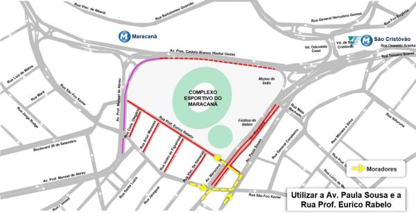 O acesso de veículos de moradores do entorno imediato ao Maracanã (ruas Professor Eurico Rabelo, Visconde de Itamarati, Isidro de Figueiredo, Artur Menezes e Conselheiro Olegário) será feito, exclusivamente, pela Avenida Paula Sousa e a Rua Professor Eurico Rabelo, mediante apresentação de comprovante de residência.