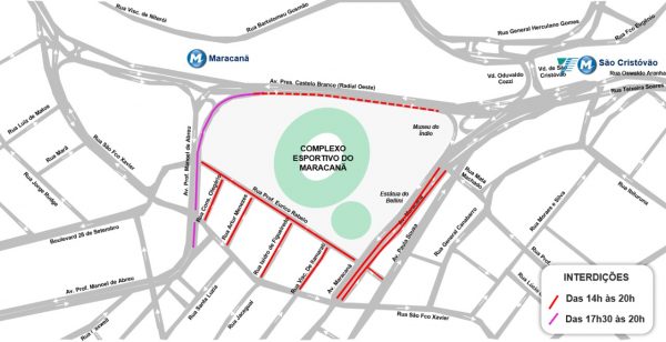 Maracanã será palco de jogo do Fluminense, pela Copa Sul-Americana - Divulgação A CET-Rio montou um esquema especial de trânsito para o jogo entre Fluminense e Botafogo, neste domingo (27/3), às 16h, no Maracanã, pela semifinal do Campeonato Carioca. Para atender ao evento, diversas vias no entorno do estádio serão interditadas:
