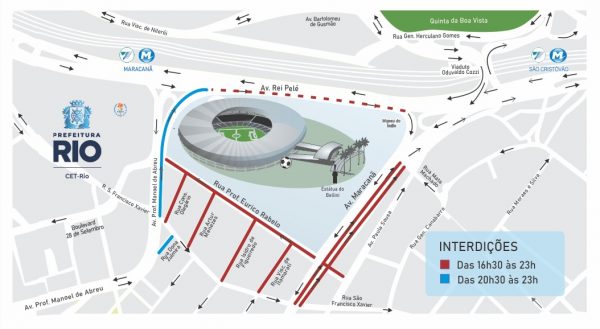 CET-Rio preparou esquema especial de trânsito para jogo no Maracanã - Marcos de Paula/ Prefeitura do Rio A CET-Rio montou esquema de trânsito para o jogo entre Flamengo e Maricá, neste sábado (22/2), às 19h, no Maracanã, pelo Campeonato Carioca. A partir das 16h30 haverá interdições ao tráfego de veículos na região do estádio. E, além dos locais regulamentados com proibição de estacionamento, outras vias estarão restritas ao estacionamento a partir das 10h. A Companhia contará com 30 agentes e apoiadores de tráfego, cinco veículos operacionais e oito motocicletas, que estarão empenhados na orientação do trânsito. E, ainda, no reforço das informações do tráfego, 13 painéis de mensagens variáveis informarão sobre os horários dos fechamentos e as rotas alternativas. Todo o conjunto é em favor da segurança viária, fluidez do trânsito, manutenção dos cruzamentos livres, como também na orientação dos pedestres, torcedores e motoristas.