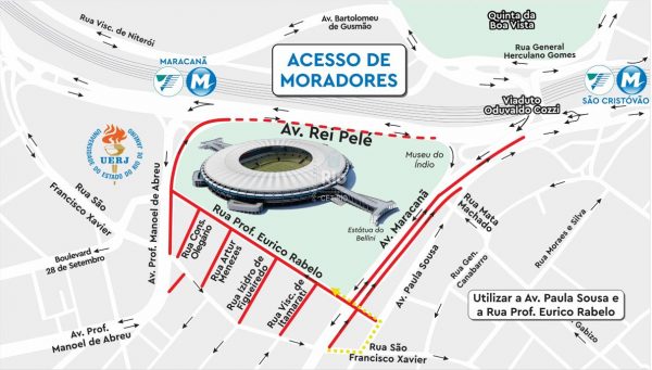 O acesso de veículos de moradores do entorno imediato ao Maracanã (ruas Prof. Eurico Rabelo, Visconde de Itamarati, Isidro de Figueiredo, Artur Menezes e Conselheiro Olegário) será feito, exclusivamente, pela Av. Paula Sousa e a Rua Prof. Eurico Rabelo, mediante apresentação de comprovante de residência.