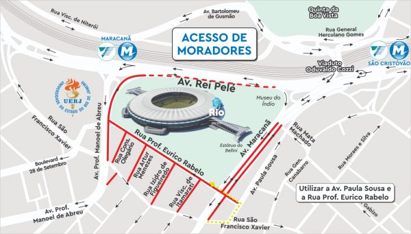O acesso de veículos de moradores do entorno imediato ao Maracanã (ruas Prof. Eurico Rabelo, Visconde de Itamarati, Isidro de Figueiredo, Artur Menezes e Conselheiro Olegário) será feito, exclusivamente, pela Av. Paula Sousa e a Rua Prof. Eurico Rabelo, mediante apresentação de comprovante de residência.