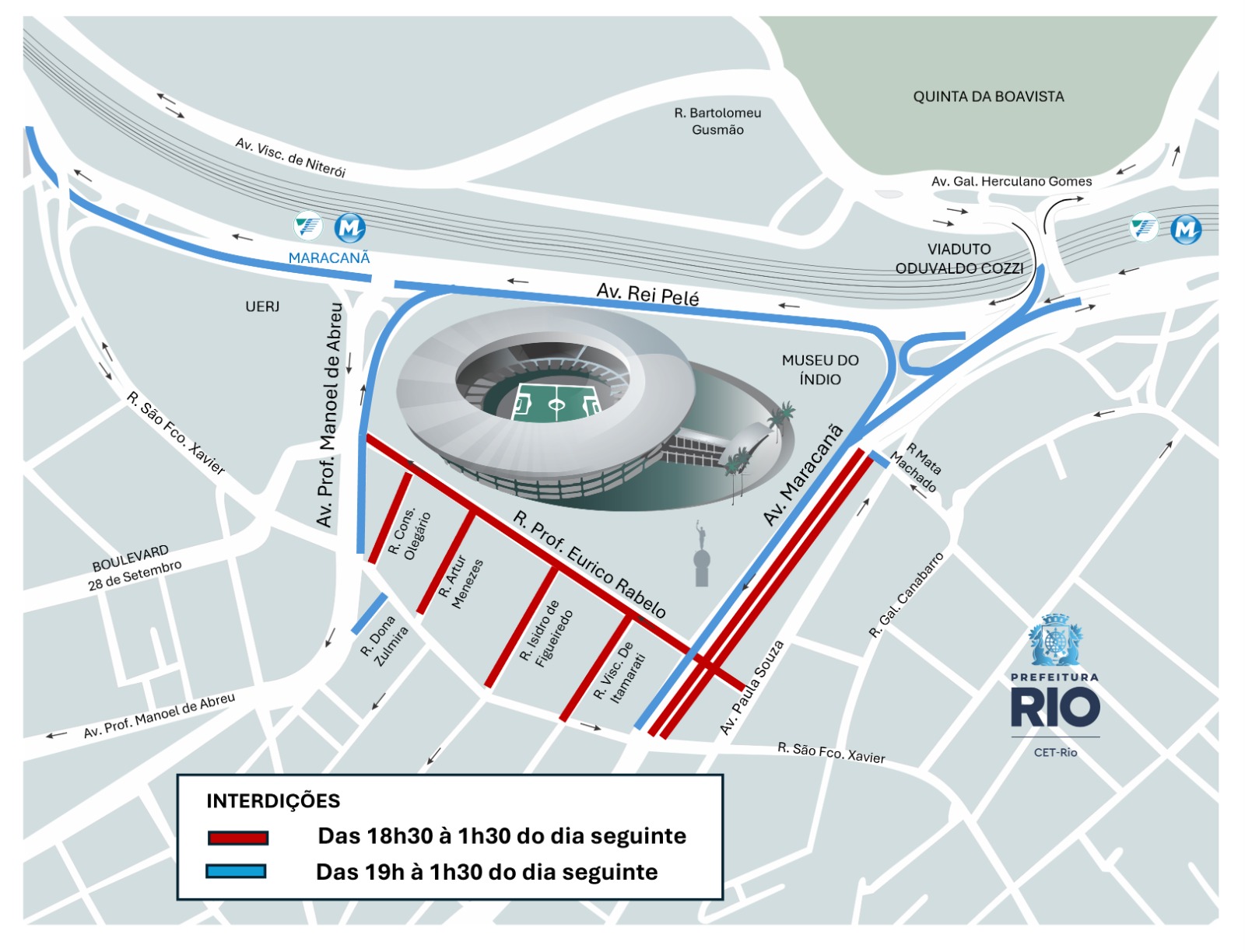 CET-Rio preparou esquema especial de trânsito para jogo no Maracanã - Marcos de Paula/ Prefeitura do Rio A CET-Rio montou esquema de trânsito para o jogo entre Fluminense e Lanús (ARG), nesta terça-feira (23/9), às 21h30, no Maracanã, pela Copa Sul-Americana. A partir das 18h30 haverá interdições ao trânsito de veículos na região. E, além dos locais regulamentados com proibição de estacionamento, outras vias estarão restritas a partir das 10h.