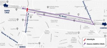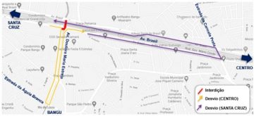 Serão desviados para a pista Lateral da Av. Brasil, sentido Centro, até a Estrada da Cancela Preta para fazer o retorno e seguir em direção a Santa Cruz.