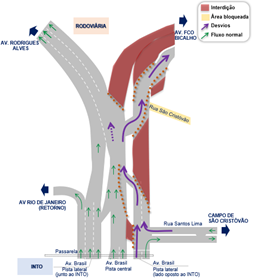 Interdição de 1 faixa (lado direito) da Av. Brasil, pista lateral junto ao INTO (sentido Túnel Marcello Alencar) e do trecho final da alça de descida da Ponte Rio-Niterói para viabilizar a segunda etapa das obras de ajustes geométricos na altura do INTO. DESVIOS: os veículos provenientes da pista lateral da Av. Brasil serão desviados para a faixa da esquerda, no trecho com estreitamento. Já os veículos provenientes da Ponte Rio-Niterói, faixa da esquerda, serão desviados para a pista lateral da Av. Brasil entre os trechos interditados.