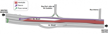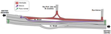 - Interdição TOTAL da Av. Brasil, pista Lateral, sentido Centro, entre o canteiro de obras localizado na projeção da Rua Prefeito Júlio de Moraes Coutinho e a Passarela 5.