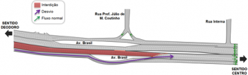 - Interdição TOTAL da Av. Brasil, pista Lateral, sentido Deodoro, entre a Rua Interna e o canteiro de obras próximo a Rua Prefeito Júlio de Moraes Coutinho;