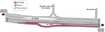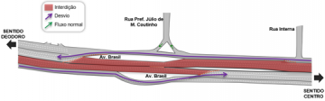 · Interdição TOTAL da Av. Brasil, pista Lateral, sentido Deodoro, entre a Rua Interna e o canteiro de obras próximo a Rua Prefeito Júlio de Moraes Coutinho;