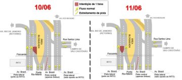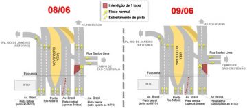 • Entre 08/06 e 12/06, das 7h30 às 12h: interdição de 2 faixas da pista Central, sentido Deodoro;