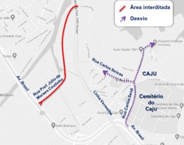 DESVIO: os veículos poderão acessar as vias internas do bairro pela Rua Carlos Seidl, na altura do Cemitério do Caju.