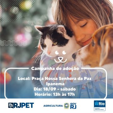 O evento, em parceria com o RJPET, vinculado à Secretaria Estadual de Agricultura, será na Praça Nossa Senhora da Paz, das 13h às 17h. Os cães e gatos da campanha vivem na Fazenda Modelo e em ONGs parceiras. Todos são vacinados, vermifugados e possuem identificação por microchip. Os animais adultos estão esterilizados.
