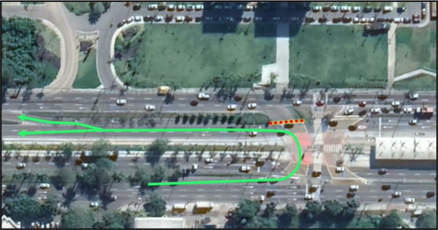 Os veículos que pretendem retornar para o Recreio ou acessar o Centro Metropolitano não poderão mais acessar a pista lateral, dando mais tempo de sinal verde aos veículos vindos da Ayrton Senna com destino ao Recreio.