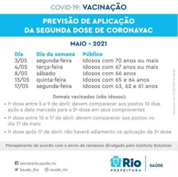 Campanha de vacinação contra a Covid-19 - Marcos de Paula/Prefeitura do Rio A Secretaria Municipal de Saúde anunciou neste domingo (02/05) as novas datas previstas para a aplicação da segunda dose da CoronaVac na campanha de vacinação contra a Covid-19 no município do Rio, de acordo com o envio de remessas divulgado pelo Instituto Butantan.