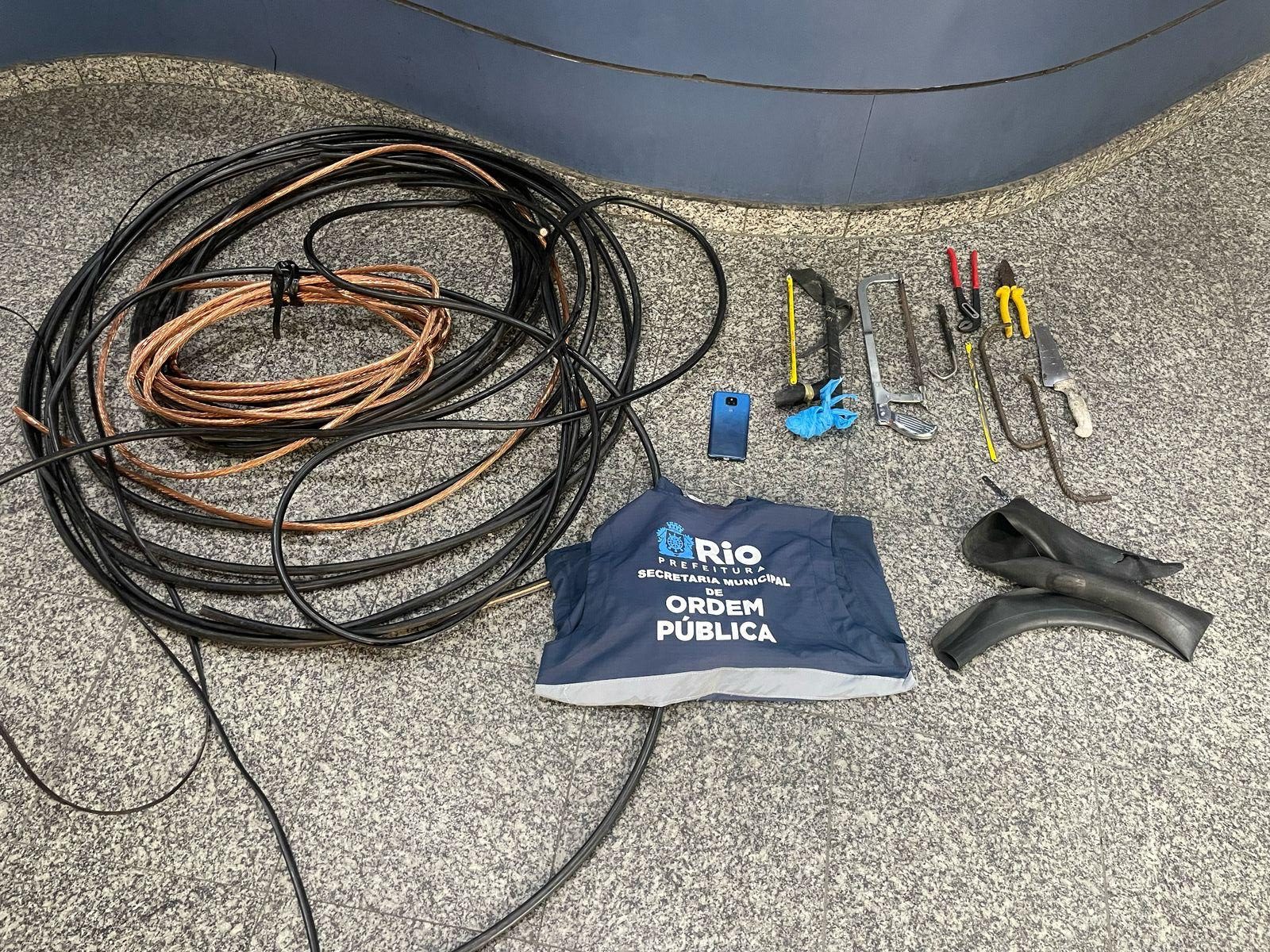 Além dos cabos, foram encontradas ferramentas como uma faca, serras, alicates e um telefone celular. Foto: Divulgação/Seop Agentes da Secretaria de Ordem Pública (Seop) prenderam, na tarde deste sábado (12/04), dois homens por receptação de cabos próximo ao Monumento a Deodoro da Fonseca, no bairro da Glória.