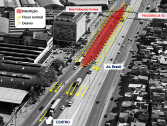 Das 15h às 18h: interdição de 1 faixa do pavimento flexível (lado esquerdo) da pista central, sentido Centro.