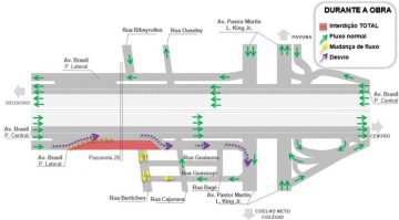 Os veículos provenientes da Av. Brasil, sentido Centro, com destino à Coelho Neto e Colégio deverão manter-se à direita da pista Central da Av. Brasil para pegar a saída, logo após o trecho em obras, para a pista Lateral. Posteriormente, deverão virar à direita na Av. Pastor Martin Luther King Júnior. A Rua Bertichen passará a ser mão dupla e a Rua Guassupi em sentido único, na direção da Rua Bertichen.