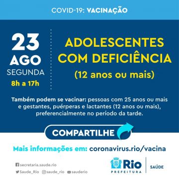 Vacinação contra a Covid-19 - Fabio Motta/Prefeitura do Rio A Secretaria Municipal de Saúde inicia nesta segunda-feira (23/08) a vacinação contra a Covid-19 dos adolescentes com deficiência a partir dos 12 anos. Neste mesmo dia, também será realizada a imunização de gestantes, puérperas e lactantes menores de 18 anos, preferencialmente no período da tarde, além de pessoas com 25 anos ou mais que ainda não tenham se vacinado.