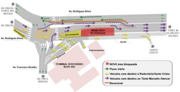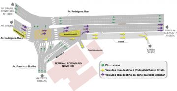 Veículos provenientes das faixas da esquerda da Av. Francisco Bicalho só poderão seguir na Av. Rodrigues Alves, sentido Av. Brasil. Já para os veículos provenientes das faixas da direita da Av. Francisco Bicalho será permitido fazer o giro a direita, sentido Túnel Marcello Alencar, ou girar à esquerda, sentido Av. Brasil.