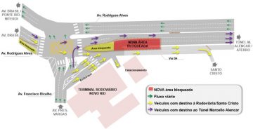 Veículos provenientes da Av. Brasil com destino ao Túnel Marcello Alencar deverão permanecer na faixa da esquerda da Av. Rodrigues Alves e seguir pelo estreitamento de pista em direção ao túnel. Nos dias úteis, entre 6h e 10h, também será possível seguir pela faixa reversível montada na pista de sentido contrário.