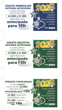 Em Copacabana, a coleta seletiva noturna no dia 24/12 será antecipada para as 15h, e a do dia 31/12 (sexta-feira) será realizada no dia 1º de janeiro (sábado), a partir das 16h.