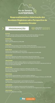 Publicado em 18/10/2021 - 14:39 | Atualizado em 18/10/2021 - 14:43A Comlurb promove, nesta terça-feira (19/10), das 9h às 12h30, o Workshop “Rio de Janeiro Sustentável: Reaproveitamento e Valorização dos Resíduos Orgânicos sob a Perspectiva da Economia Circular”. A ideia é debater temas ligados ao combate à insegurança alimentar na cidade em tempos de pandemia. Tendo em vista os protocolos de distanciamento social, ainda necessários, o evento será online e as palestras dos especialistas transmitidas pelo canal da Comlurb no YouTube. No fim, haverá um espaço para perguntas formuladas pelo WhatsApp, no número (21) 98533-6834.