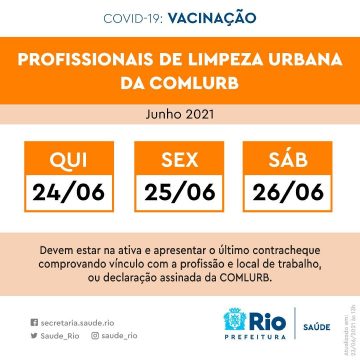 Imunização dos profissionais da Comlurb - Fábio Motta/Prefeitura do Rio A Prefeitura do Rio divulgou nesta quarta-feira (23/06) que vai vacinar, entre quinta-feira (24) e sábado (26), profissionais de limpeza urbana da Comlurb com 18 anos ou mais. Os profissionais devem estar na ativa e apresentar o último contracheque comprovando vínculo com a profissão e o local de trabalho, ou declaração assinada da Comlurb.