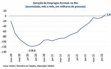 Desde março de 2020, primeiro mês da crise sanitária no Brasil, até agosto, a cidade chegou a perder 118,6 mil empregos formais. A recuperação começou em setembro do mesmo ano. Apesar da piora da pandemia em 2021, a capital fluminense fechou o ano com a geração de 82,5 mil. Nos dois primeiros meses de 2022, foram criados 15,8 mil novos postos de trabalho formais, deixando a cidade com um saldo positivo de 5,8 mil empregos.