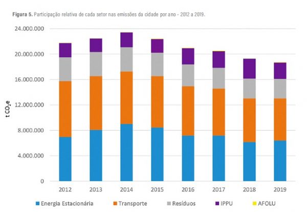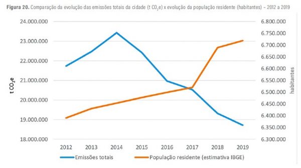 Os números do inventário mostram que as emissões de GEE da cidade vem caindo, ano após ano, a partir de 2015, após atingirem um pico de 23.427.938 de toneladas de dióxido de carbono equivalente (t CO2e) em 2014. Esse pico tem grande contribuição da matriz elétrica mais suja, por conta da crise hídrica naquele ano.