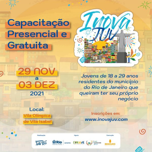 O curso será realizado entre os dias 29 de novembro e 3 de dezembro, das 13h às 17 - Divulgação Estão abertas as inscrições para o curso Inova JUV, novo programa de capacitação em empreendedorismo da Secretaria Especial da Juventude Carioca (JUVRio). Durante uma semana na Vila Olímpica Artur da Távola, em Vila Isabel, na Zona Norte do Rio, jovens em situação de vulnerabilidade social irão aprender como desenvolver seus próprios negócios, além de entender como gerar renda, trazendo melhores condições de vida para si e sua família.