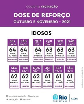 Vacinação contra a Covid-19 - Marcos de Paula/Prefeitura do Rio O calendário para aplicação da dose de reforço contra a Covid-19 está disponível. Até o dia 13 deste mês, todos os idosos com 61 anos ou mais serão vacinados na cidade do Rio. Além disso, as datas para trabalhadores e profissionais de saúde divulgadas anteriormente seguem valendo e estão disponíveis no site: coronavirus.rio/vacina.